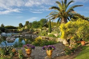 Created on the site of a medieval quarry the garden has been built up around the rock. The main feature of the garden is a large natural lake with rock sides that have been planted with some amazing agaves.