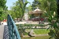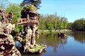 Park met water, bruggen, speeltuintjes en een kleine grot.