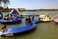 Pret in en op het water met een lange, drijvende constructie. Daarin zitten opblaaskussens maar ook…