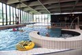 Een binnenzwembad met speeltuin voor de kinderen, en een buitenzwembad met glijbanen. Het water in h…