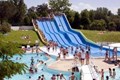 Zwembadcomplex met diverse zwembaden en glijbanen, in het weelderige groen van het park Gourjade. Er…