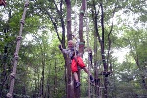 High wire adventure park in a forest with century old oak trees near Bordeaux. Tyroleans, giant divejumps and children courses.