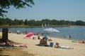 Strandje aan het meer van Lavaud met toezicht op het zwemmen. Er is ook een speeltuin, een midgetgol…
