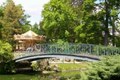 Park met water, bruggen, speeltuintjes en een kleine grot.