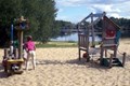 Een meer middenin een naaldbos, met speeltoestellen en visgebieden.