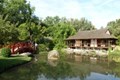 Park in Japanse stijl, met een visvijver, een Japans huis en een Japanse brug.